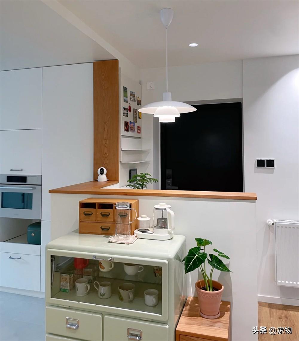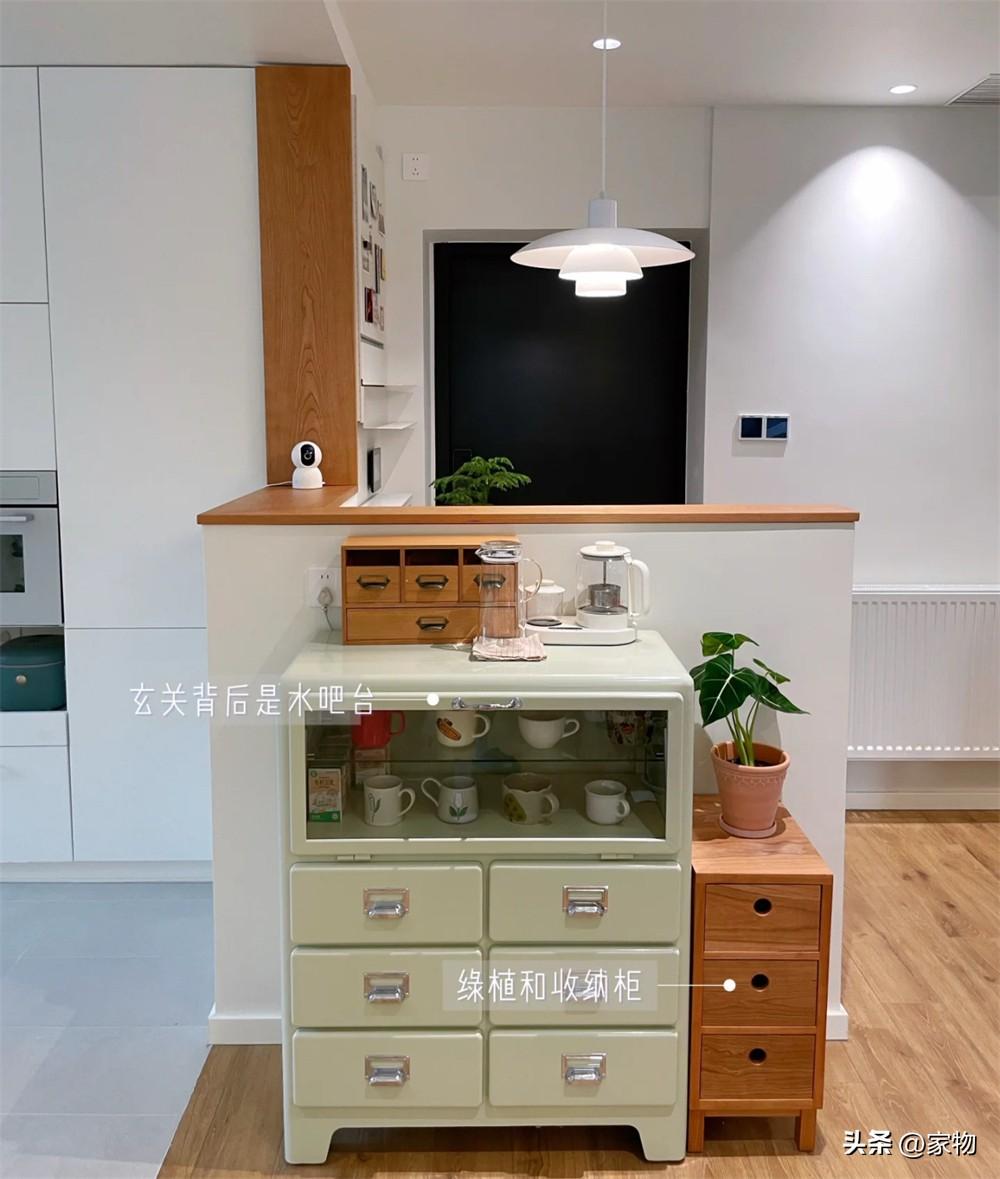 就連半牆的背面,也用水吧檯和綠植櫃進行收納利用,既可以起到收納的效果,又能放下很多可愛的杯盞碗碟。