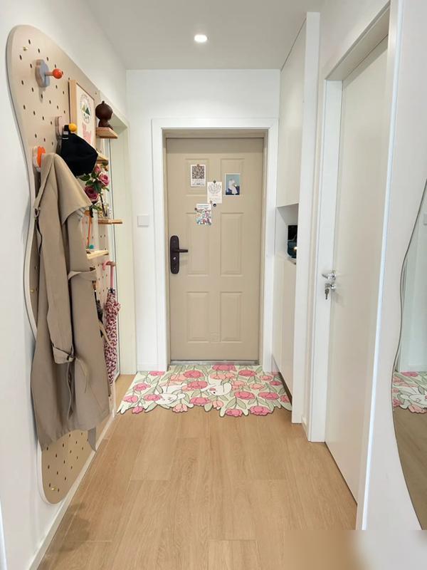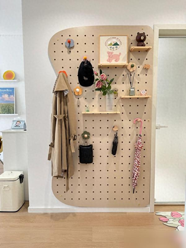 玄關鞋櫃和次臥共用一堵牆,薄得跟書本似的洞洞板掛滿外套鑰匙,牆上還開出展示格放小擺件。