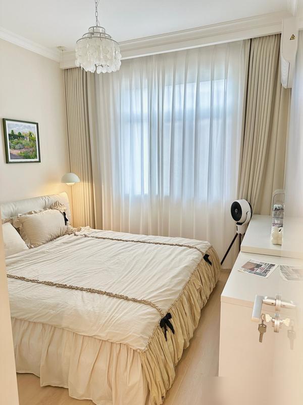 白牆配法式石膏線這種基礎操作,人家用菱花白刷出柔光效果,比冷白色貴氣又不顯髒。
