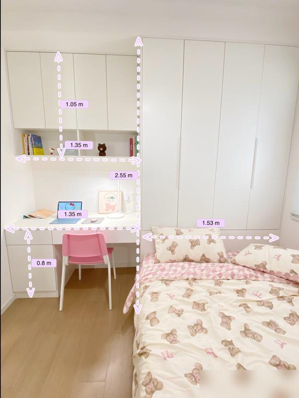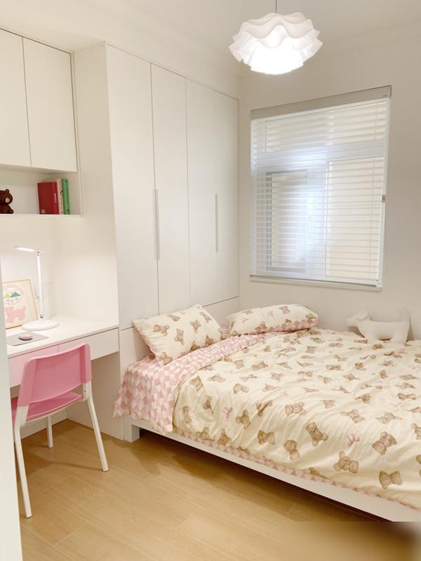 次臥更是把空間榨出油水,牀櫃書桌嚴絲合縫拼成整體,活像變形金剛合體。