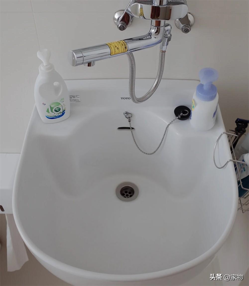 這位廣州姑娘在測量好洗手池上下水位置,和尺寸後,選了一個55釐米寬的小型拖把池,並將原本應該安裝在陽臺或衛生間地面的拖把池,吊裝在了洗手池的位置,當成一個一體式的懸空陶瓷盆。