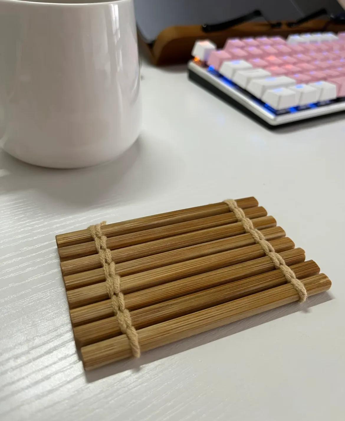 家裏用舊的筷子都有吧?實在沒有了攢幾雙一次性筷子也不難,然後用繩子在兩邊每跟交叉綁一綁,一個要質感有質感,要耐用性有耐用性的杯墊就誕生了。