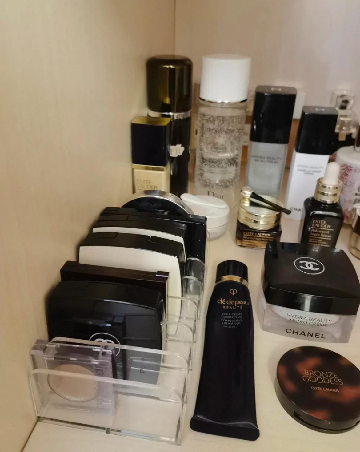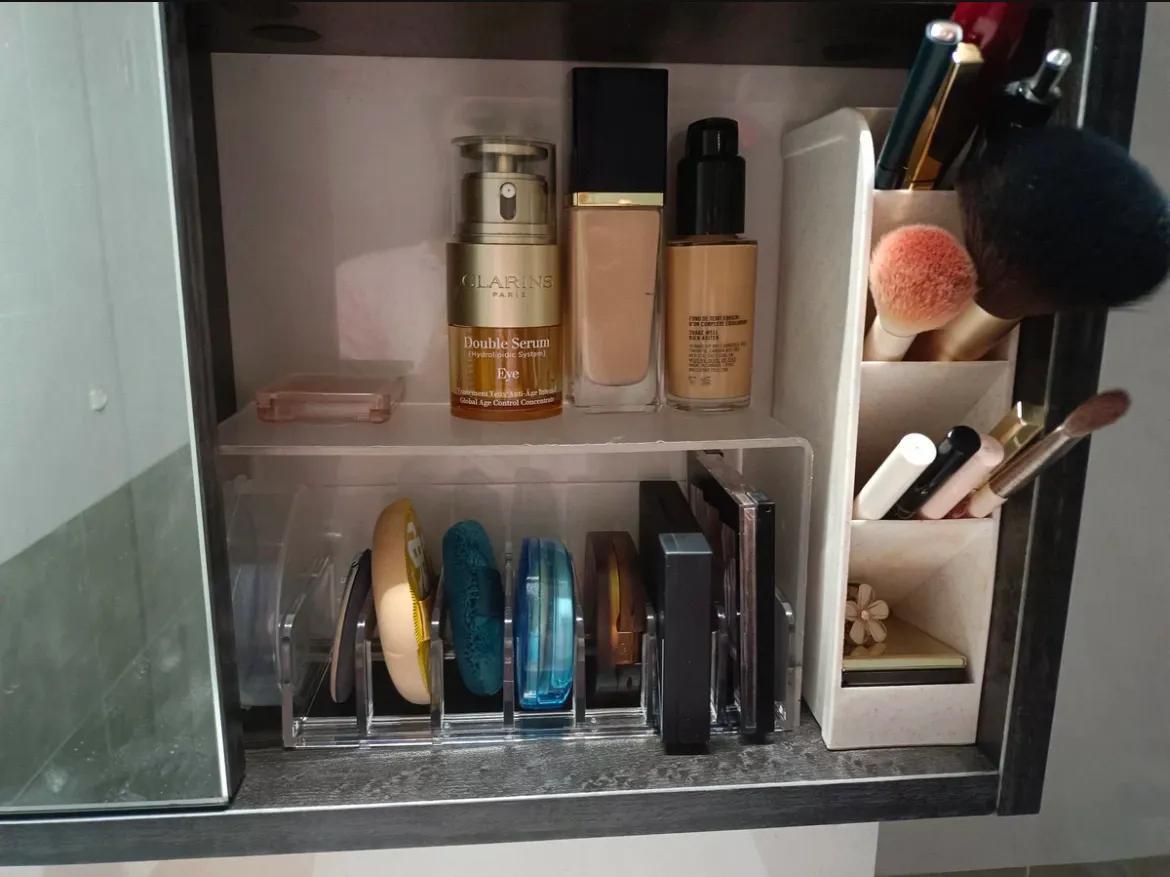 比如,它的間距大小塞粉餅、腮紅剛剛好,放在抽屜裏,物品縱向排隊站立、不倒塌,拉開抽屜井井有條的;