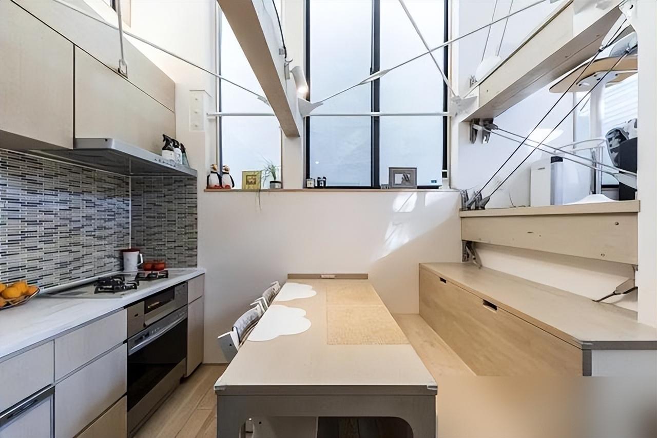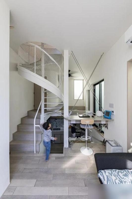 樓梯底下塞儲物櫃,餐桌抽屜藏餐具,連防墜網都安在旋轉梯上——每個角落都在“打兩份工”,活脫脫把空間掰成兩半用。這種“兼職設計”太接地氣了,誰家沒有一堆零碎玩意兒?與其抱怨地方小,不如學學這種“見縫插針”的智慧,讓雜物各就各位,地面自然清爽。