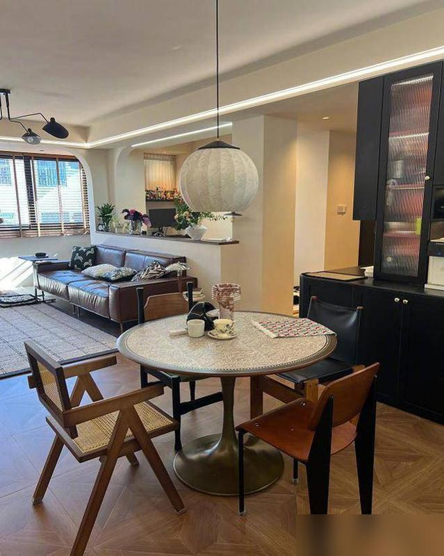 這戶人家倒好,玩的是“減法美學”——玄關那抹深綠撞上黑櫃子,復古味自然透出來;藤編餐椅配圓桌,坐下就想端杯茶發呆,實用和美感捏得死死的。