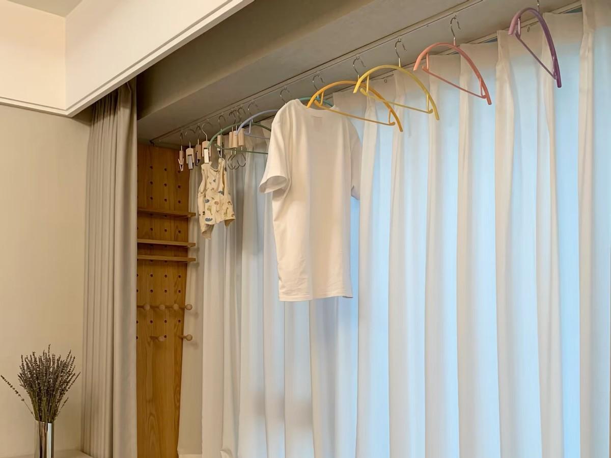 即使是晚上,把衣服晾在外面,把窗簾一拉,裏面也看不見,一點也不影響。白天就更不用說了。體驗一段時間以後,我發現飄窗晾衣服,真的纔是目前階段的首選。