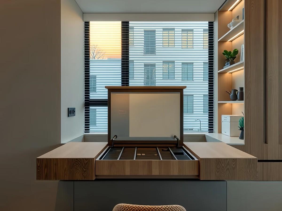 因爲整個鏡子是隱藏式的,不用的時候扣上,就是一個桌面。它兩面有收納盒,可以用來放書。化妝品一般都是收在底下的抽屜裏。