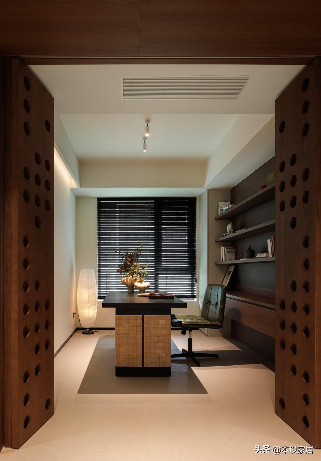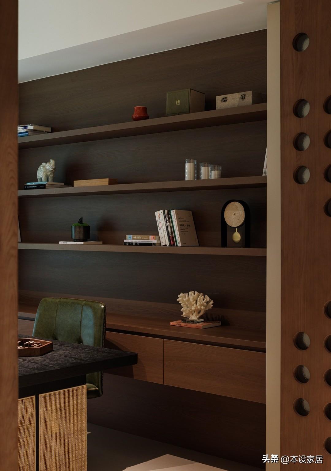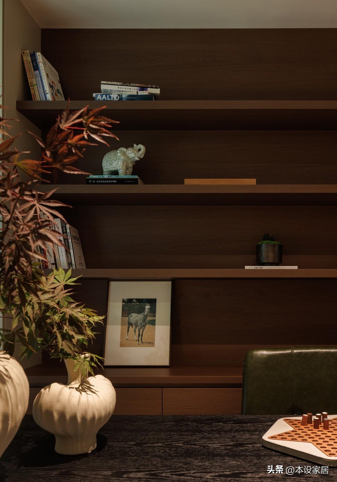 書房的面積約8㎡,整體的設計延續了簡約的調性,靠右邊的牆面定製了一組帶抽屜的實木層板收納櫃,搭配舒適柔軟的黑色皮革座椅和經典單品的書桌,再加上綠植的點綴,中古韻味和現代功能得到完美融合。
