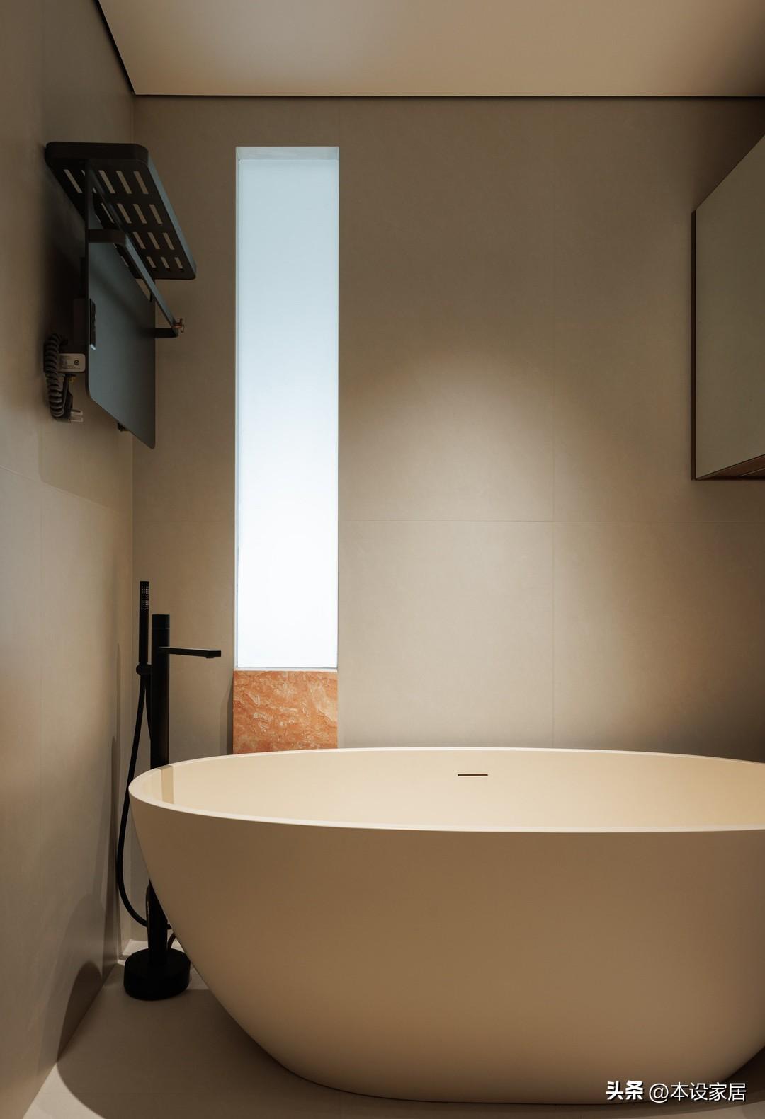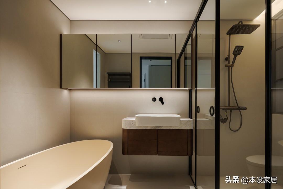 這是主衛,借用主臥部分面積後,不僅擁有獨立的淋浴房,實現乾溼分離,還增加了一個超大的落地浴缸,以及大尺寸的鏡面收納櫃,米白色的牆地磚搭配黑色的五金件,給空間增添了一份精緻感。