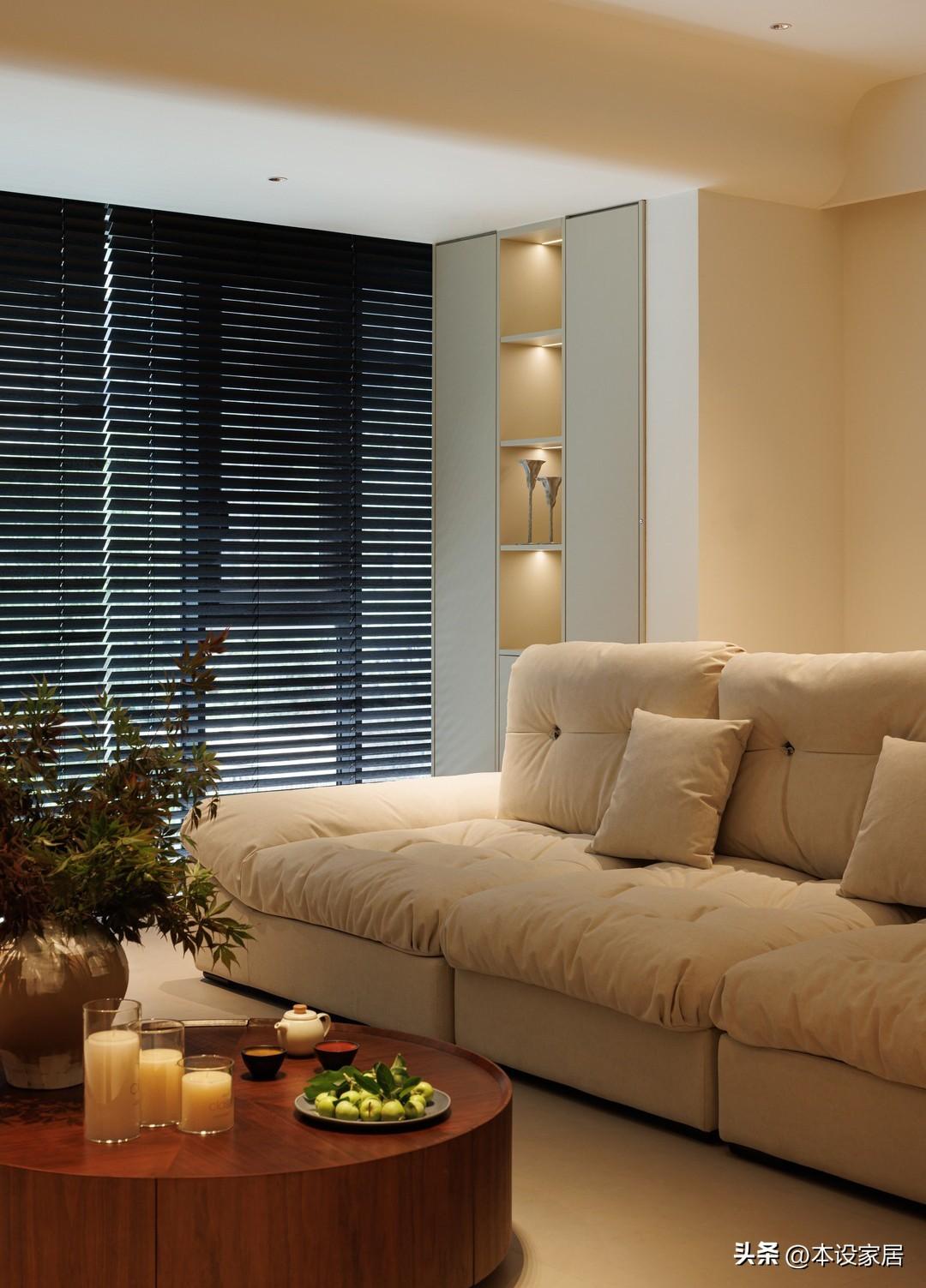 在傢俱配置上,以一組寬大的米白色布藝沙發,搭配圓形的實木茶几,在綠植和暖光燈的點綴下,呈現出一種簡約而不簡單的中古風格調。