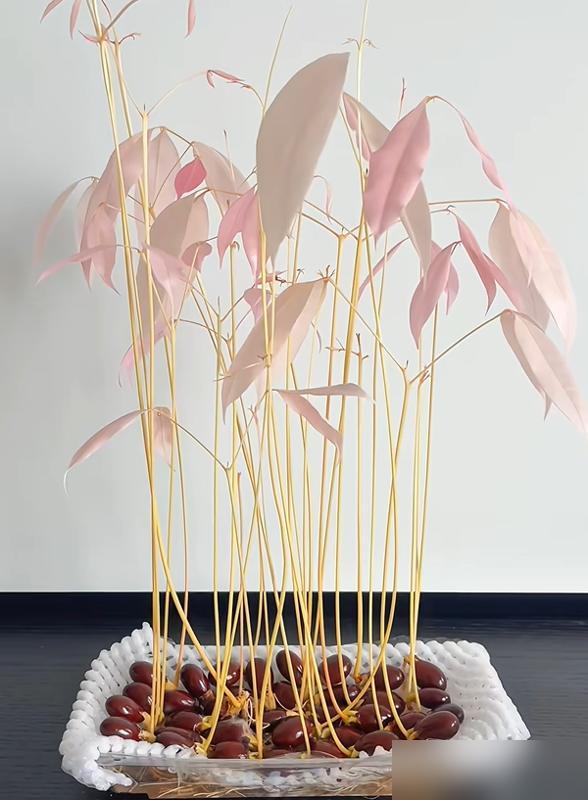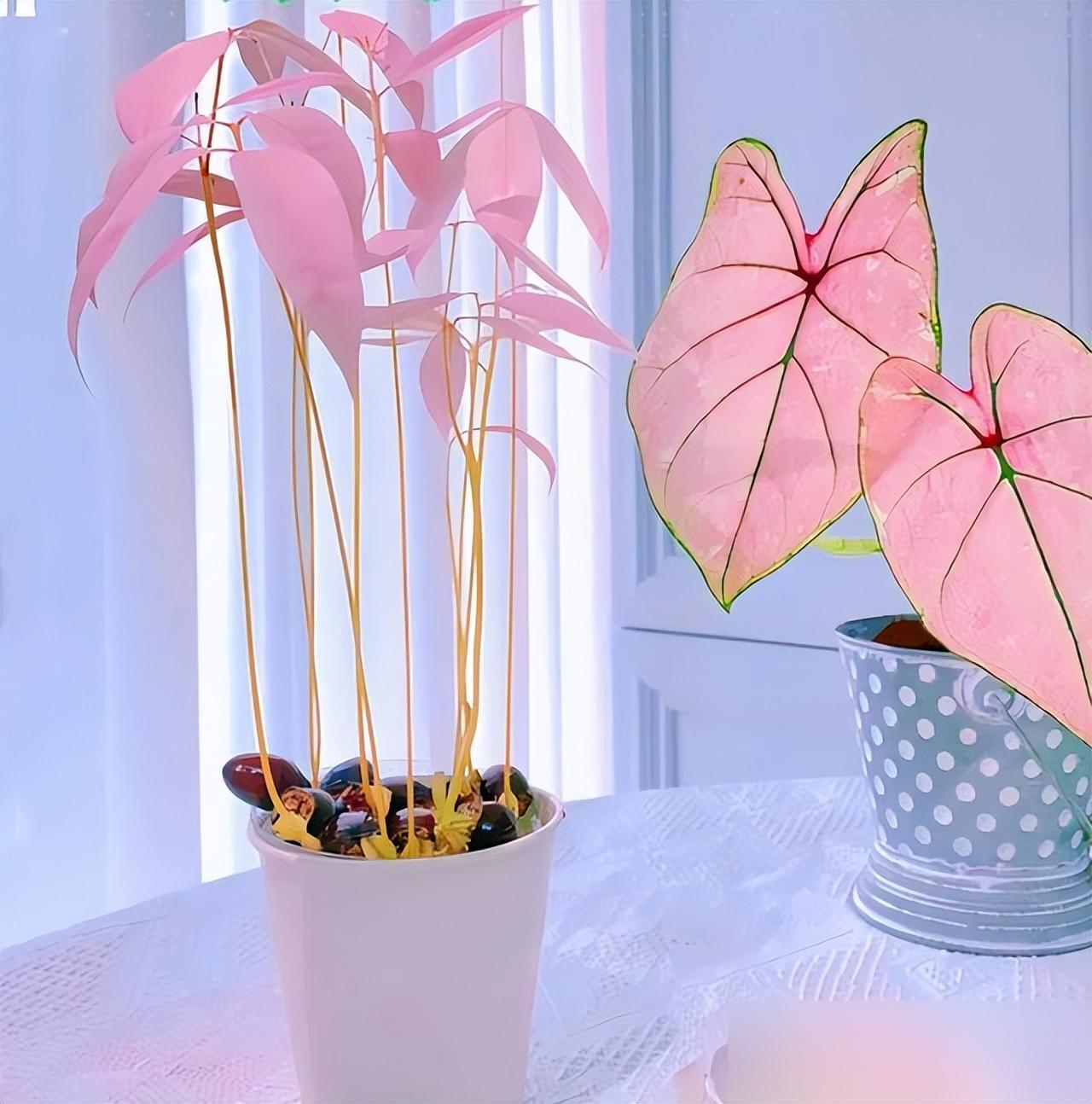 最絕的是那片粉嫩葉子,祕訣全在“躲貓貓”。從水培開始就塞櫃子或紙箱裏,完全不見光,葉子就跟塗了胭脂似的,軟乎乎一層疊一層。兩週光景,“粉森林”就竄出來了,燈光下透亮得像童話世界。