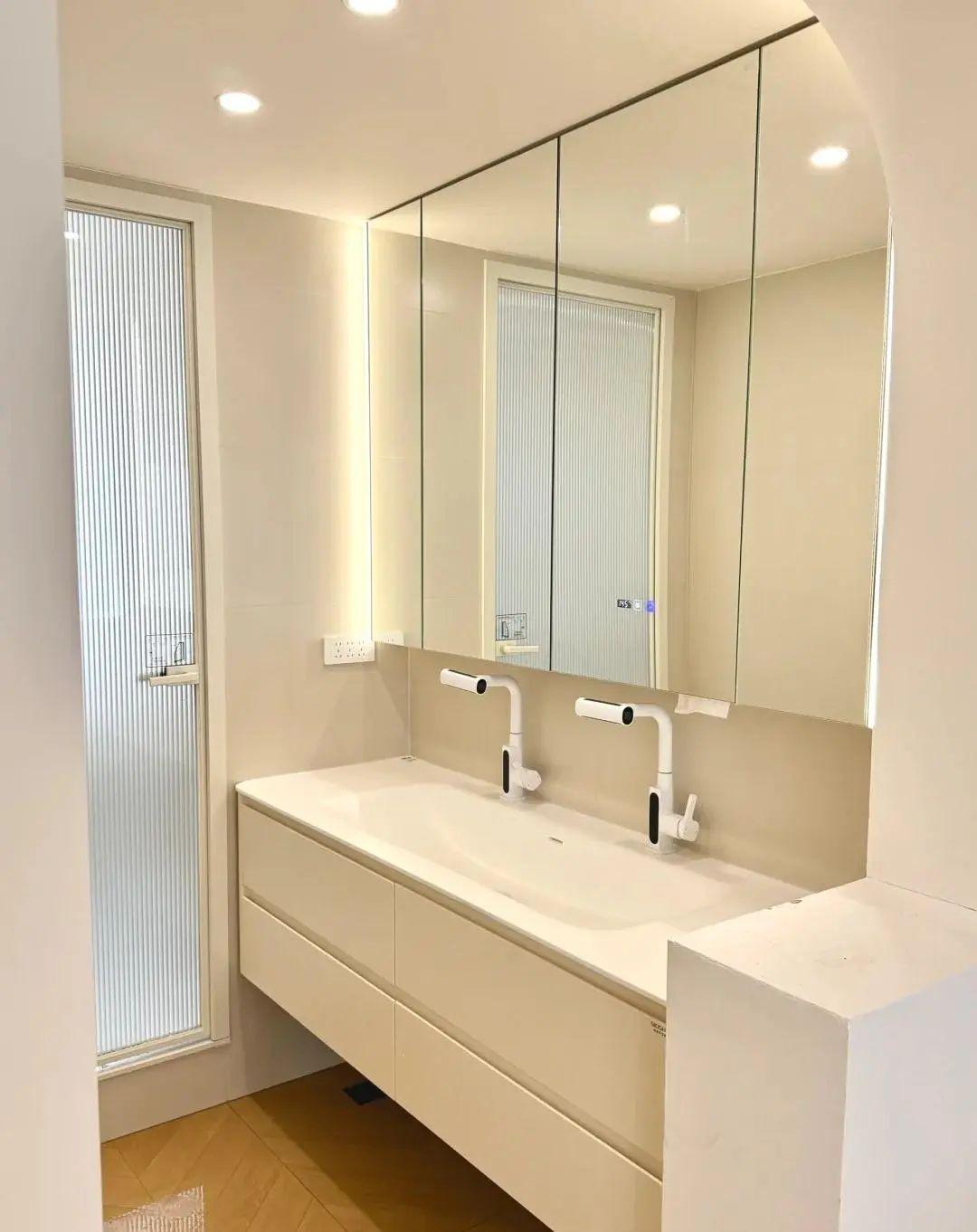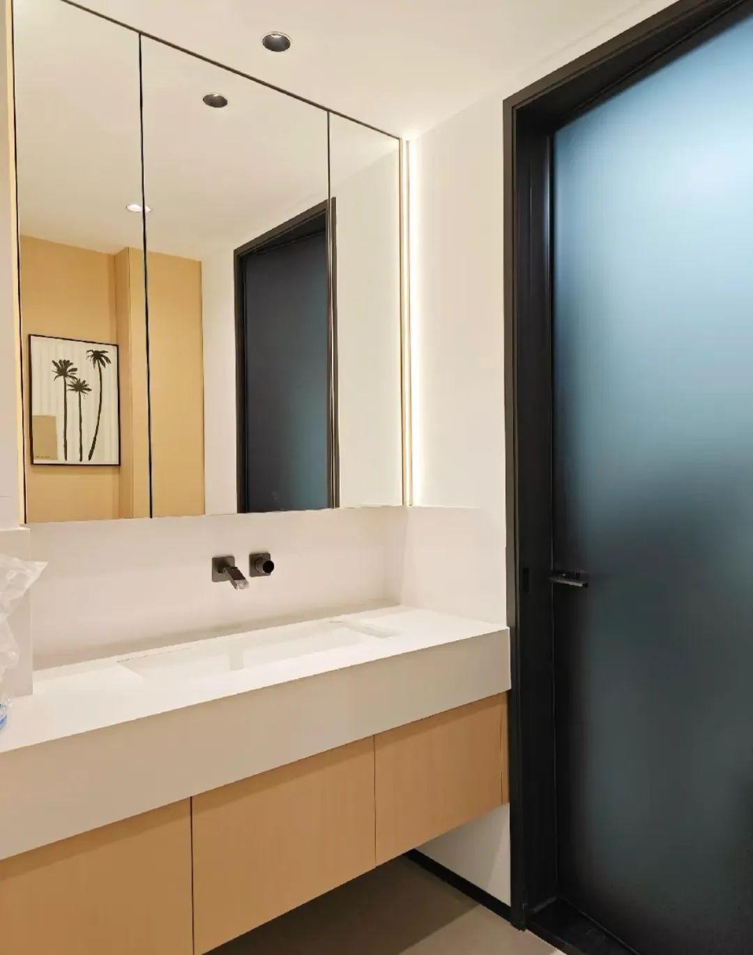 和定製的廠家溝通後,按照我家的尺寸,定製了超大的鏡面,兩側做發光燈帶,裝上之照的衛生間都大了一倍,空間視覺感特別舒服。