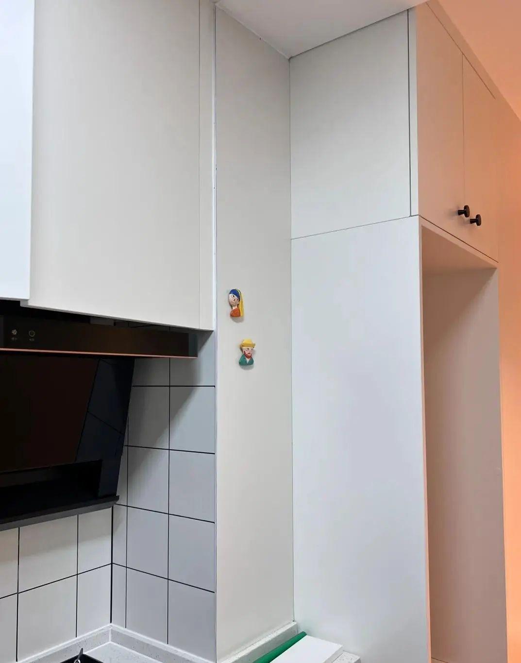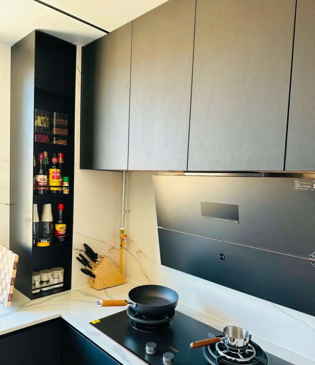 煙道爆改後:貼合煙道壁設計了一個進深爲10cm調料薄櫃,裏面放置的活動層板,可以根據調味品的高度調節,從櫥面刀頂的高度足以放下所有廚房調味料包。