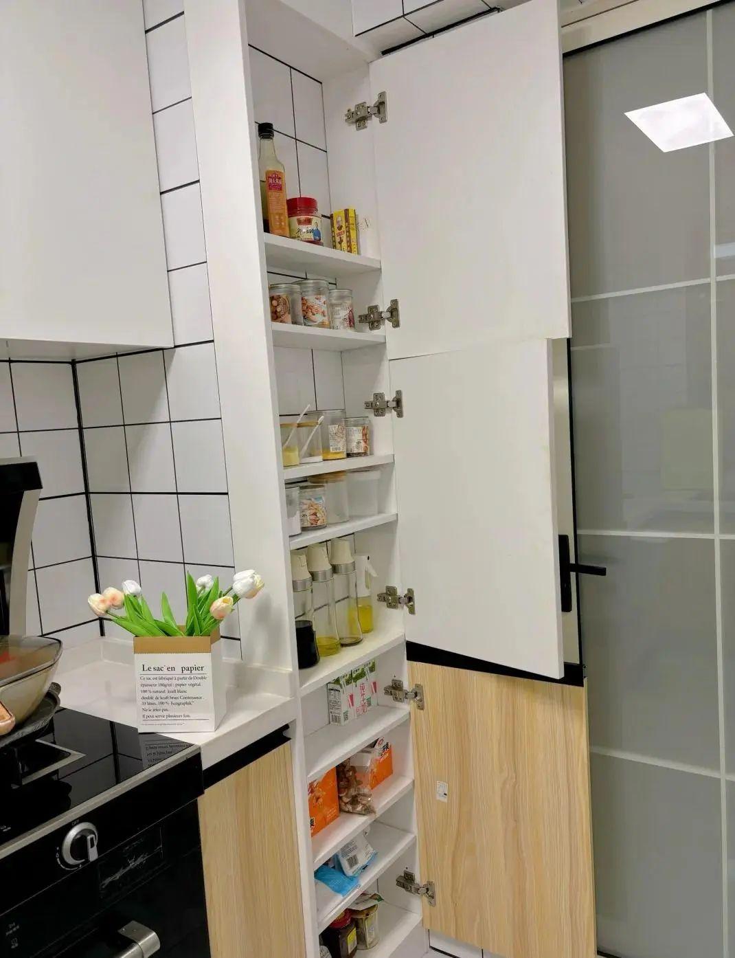 那些花花綠綠的調味瓶被收納起來,檯面整個清爽起來,做飯時打開拿取方便,做完飯櫃門一關乾乾淨淨。