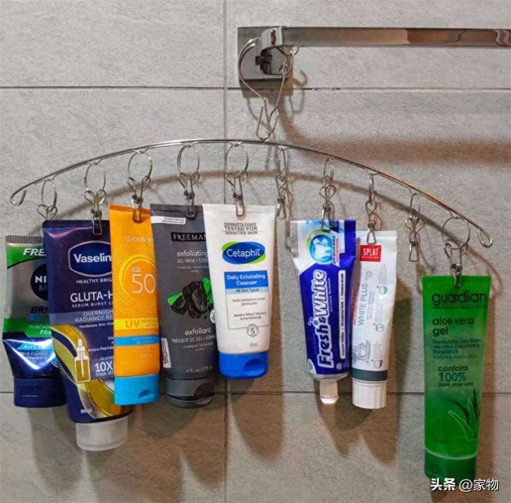 衛生間洗手池檯面之所以雜亂,大多時候都是因爲這各種清潔洗漱用品,與其放在臺面上,倒不如找個不用的晾襪架,將牙膏、洗面奶等各種護膚品夾上去,再掛到毛巾架上。