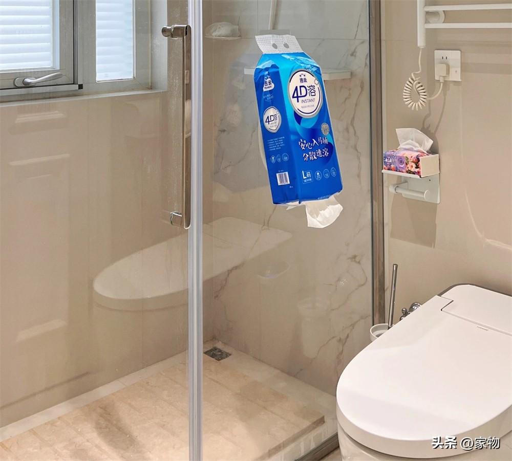 這種四聯包的紙抽,完全可以保留原本的包裝,在底部開上一個小口,再倒掛到掛鉤上,就可以一張張從底部抽出了。