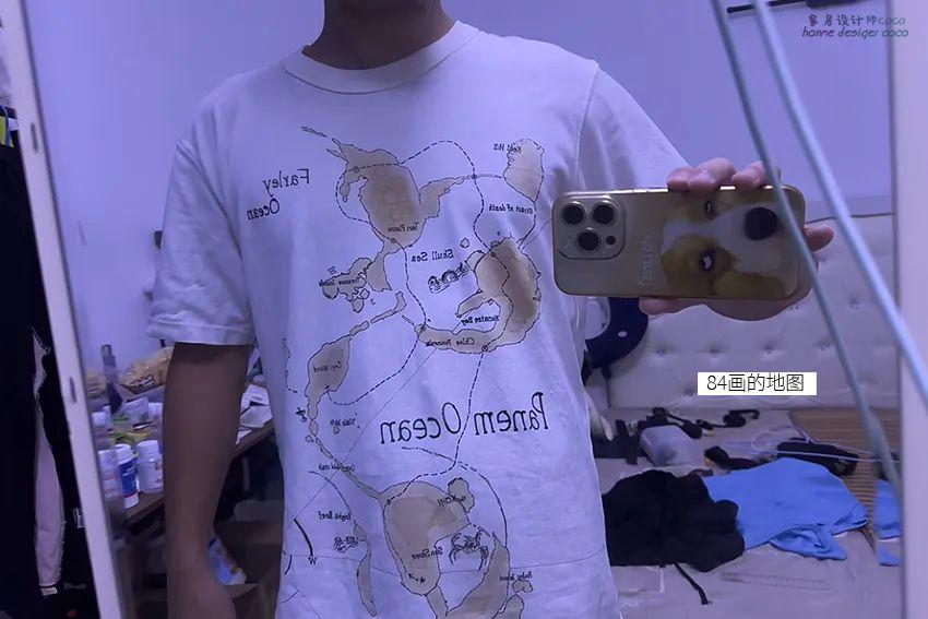 這題我會!不想穿的舊T恤,利用84+咖啡液滴出來的地圖,然後自己又畫了點東西。