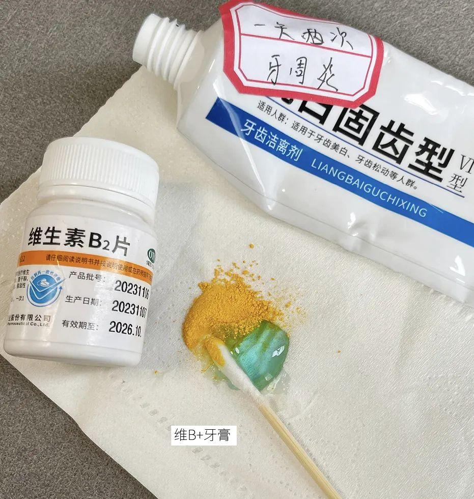按照醫生的方法,除了內服,還要將維生素B2碾成粉末,倒在翳用牙膏上,搭配巴氏刷牙法去刷牙。[堅持刷3分鐘]
