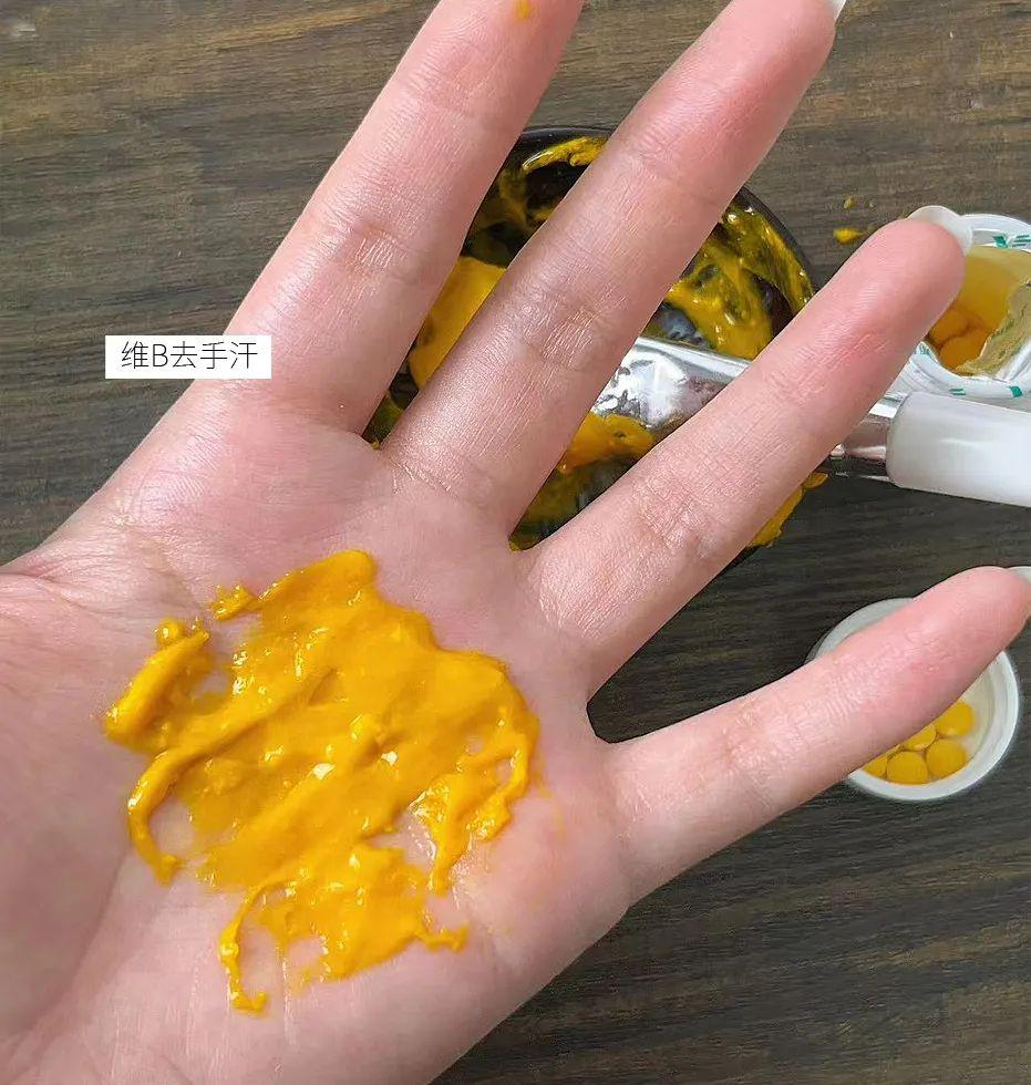 將把B2粉末和蘆薈膠混合,敷手上5min,擦掉後再整兩下止汗噴霧,就可以輕鬆蓋特乾爽小手。