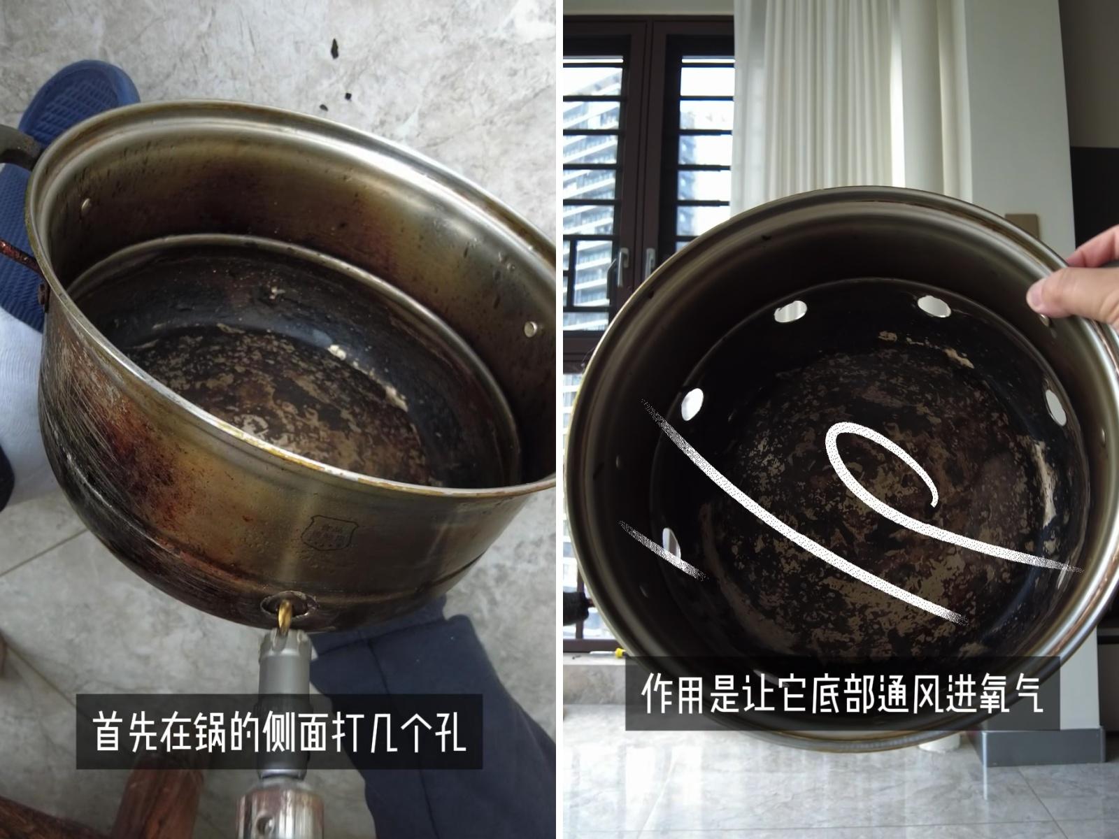 我照着網友「@豆豆媽」的方法試了試,效果出奇的好。先用鑽頭在鍋身側面打幾個通風孔,這樣燒炭時能保證氧氣充足。