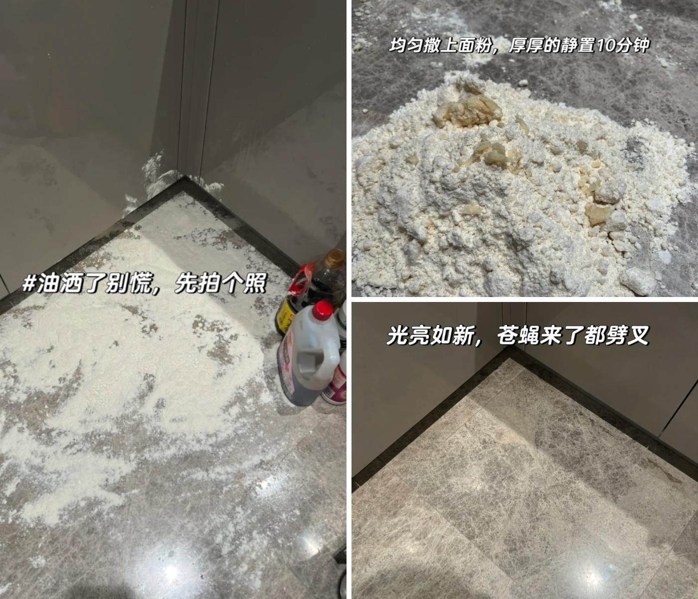 最絕的是處理打翻的油漬。上次我家熊孩子把香油瓶摔了,地上油汪汪一片。撒上過期麪粉等它吸油,輕輕一刮就帶走大部分油污。要是還有殘留,就再撒點麪粉補刀,最後用洗潔精水拖一遍,地板立馬恢復如新,省心又省力!