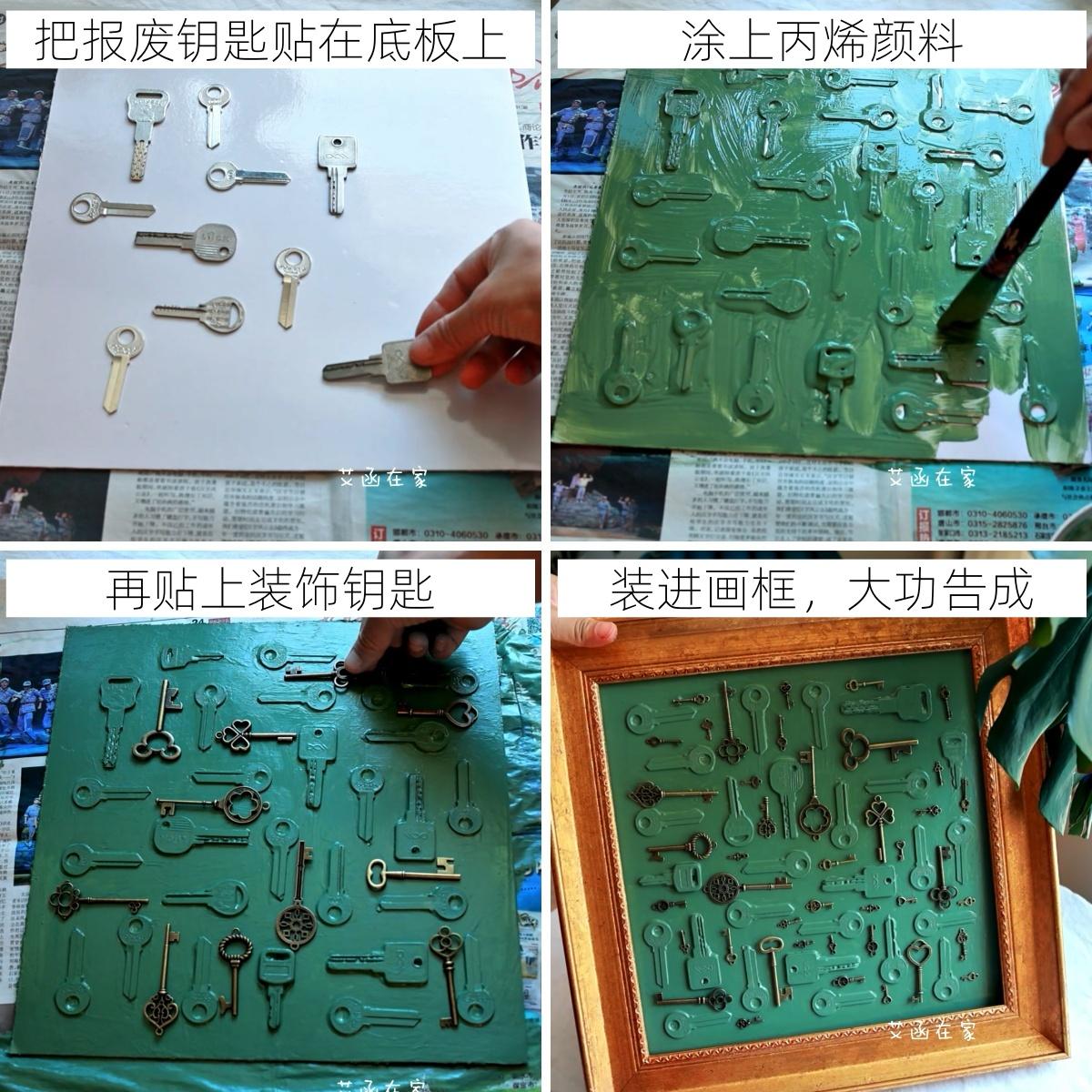 方法也很簡單,買個畫框,把報廢的舊鑰匙用膠水粘貼在底板上,塗上丙烯顏料。幹了後再貼上覆古裝飾鑰匙,裝進畫框裏就大功告成了,掛在牆上特別吸睛,怎麼看怎麼美。