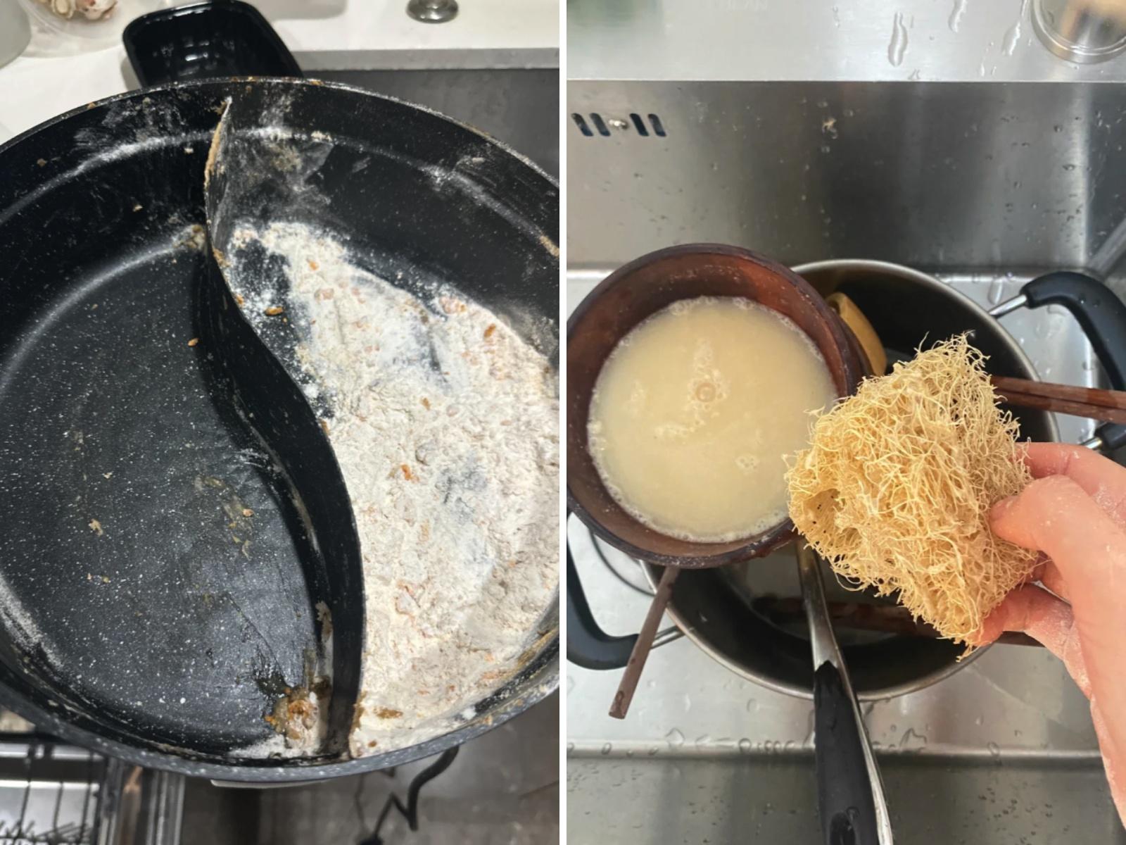 平時燉牛羊肉的鍋碗特別油膩,洗潔精都難搞定。這時候抓把過期麪粉搓一搓,油脂立馬被吸附得乾乾淨淨,水一衝就亮堂堂的。原理很簡單,麪粉的吸附能力特別強,對付動物油脂比洗潔精還管用!