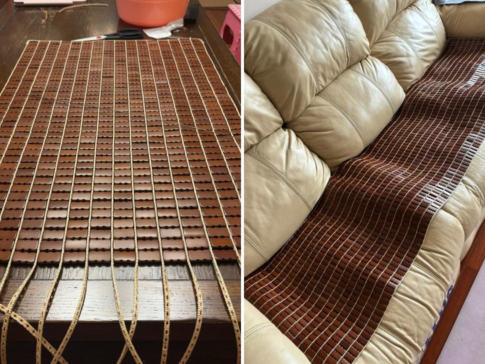 其實這麻將涼蓆改造成沙發墊特別合適!鋪在布藝沙發上,既隔熱又透氣,開空調坐着也不會覺得太涼。