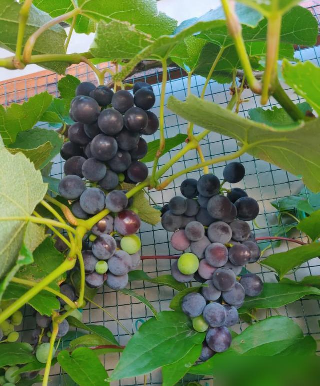 10平米的小地方,硬是整出一片“綠瀑布”,葡萄串掛得像水晶簾子,陽光一照透亮透亮的。