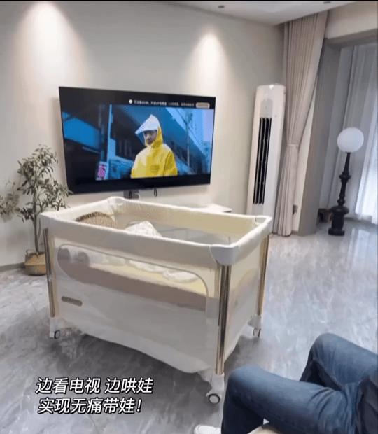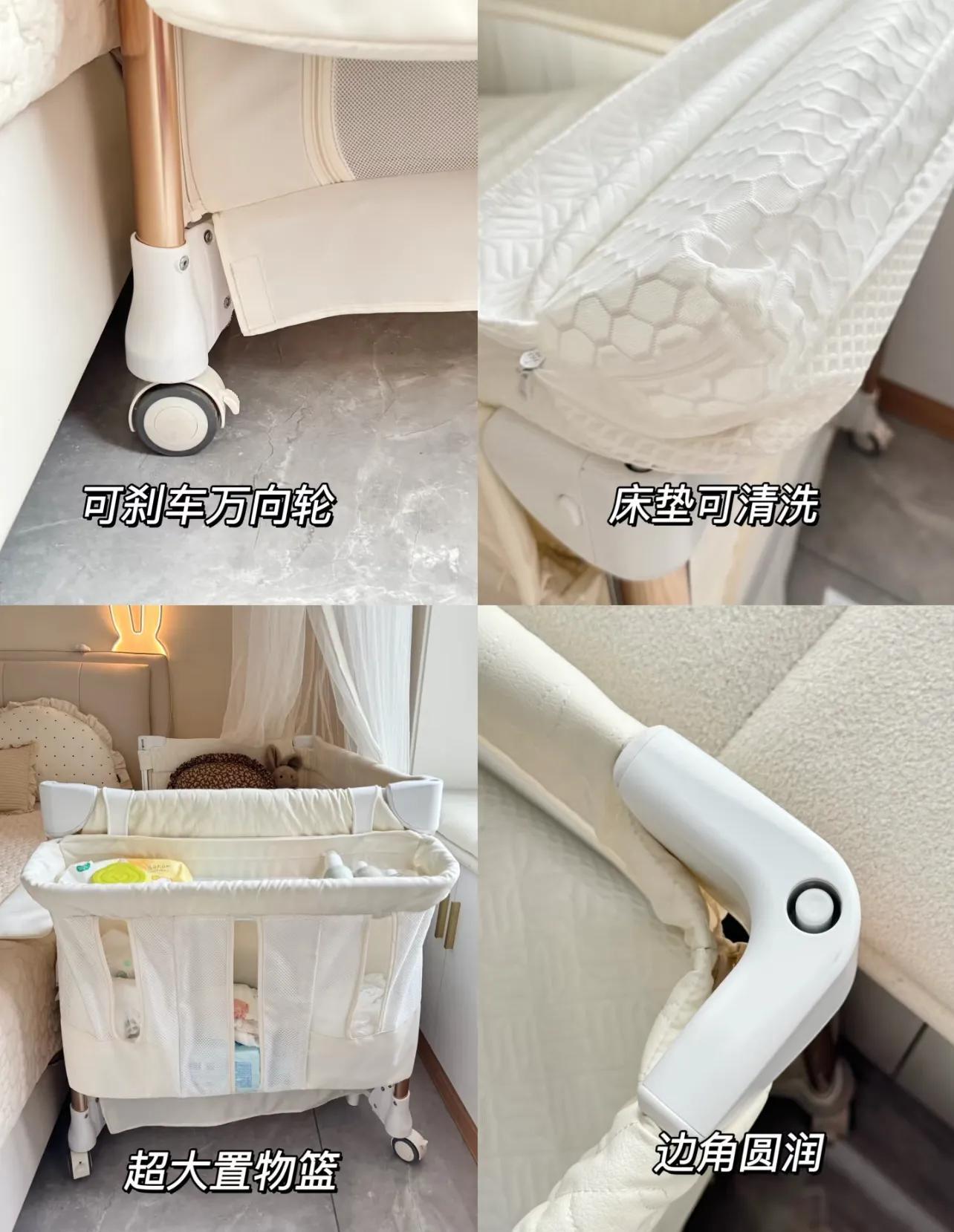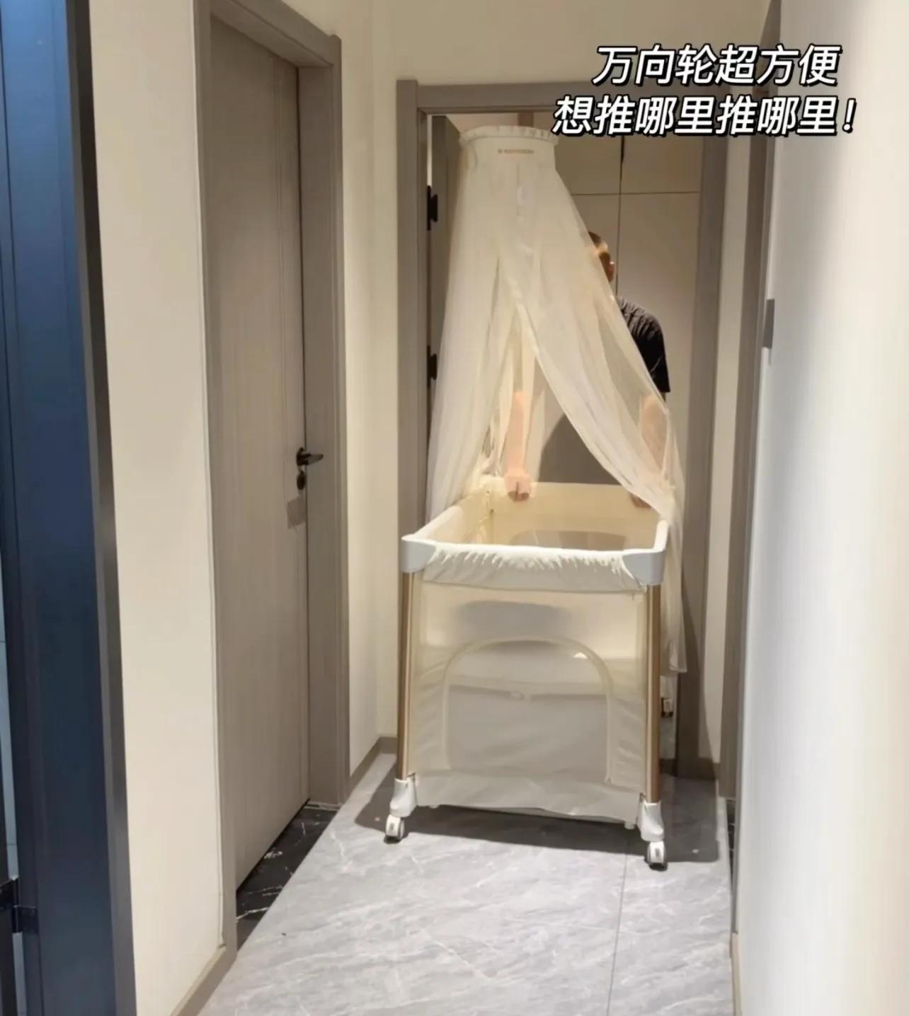 重點是它底部有萬向輪,想推去哪就去哪,忙家務的時候直接把牀推到眼前,娃不哭不鬧,大人也放心做事;