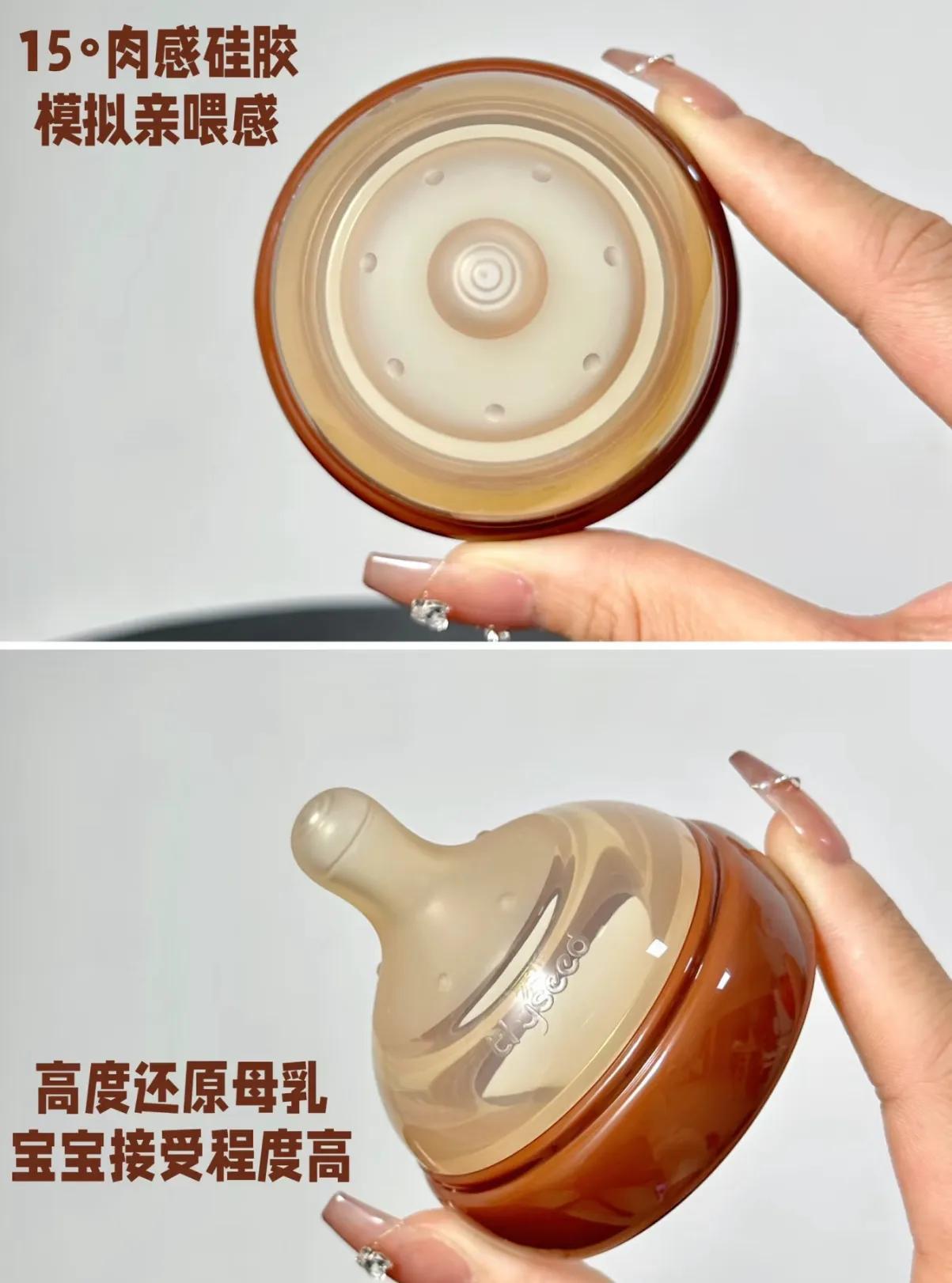 觸感和膚色和咱們肌膚差不多,15°肉感硅膠,媽媽般柔軟,寶寶就會非常有安全感,接受起來也更快,寶寶頭一回用的時候就接受了,噸噸噸喝了半瓶奶呢!老母親感動到想流淚~