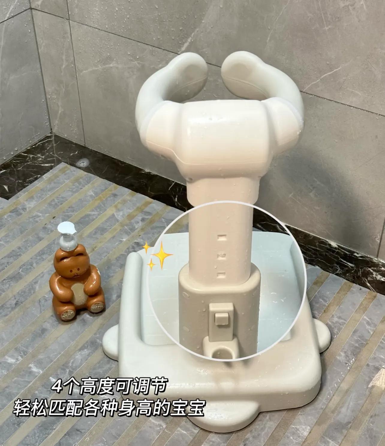 而且它是環抱式手臂設計,孩子站在上面很安全,不用擔心摔倒或脫落風險,只要拿噴頭給孩子身上衝就完事啦;