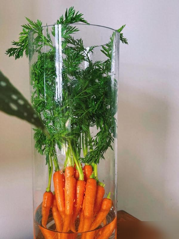 可胡蘿蔔纓子偏不慣着這矯情勁兒:剪下帶芽的頭頂,水位淹過底端一釐米,北窗臺散光處隨意擱。