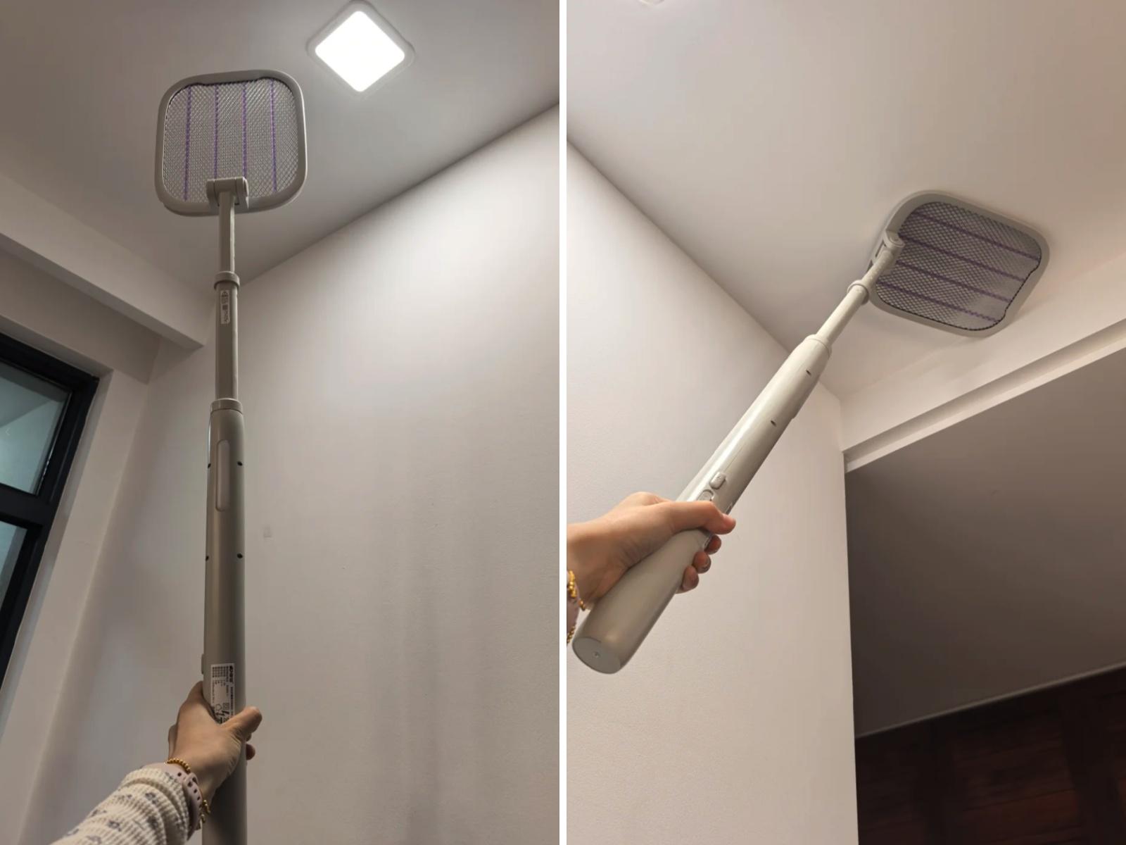 普通電蚊拍確實夠不着天花板上的蚊子,但換成這種多功能款就方便多了。它不僅能伸縮,還能當滅蚊燈用。