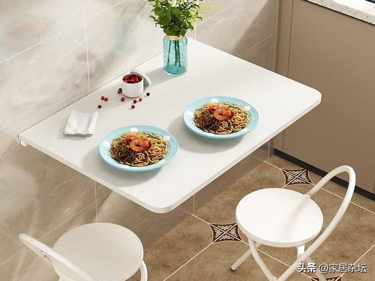 她們在靠近廚房的側面牆,訂了一款超薄的壁掛摺疊桌。桌面採用的是輕盈堅固的實木,厚度僅僅一兩釐米。平時,完全貼合牆面,收起來像一個裝飾性的層板,視覺上幾乎隱形。而且,不佔用任何的空間。