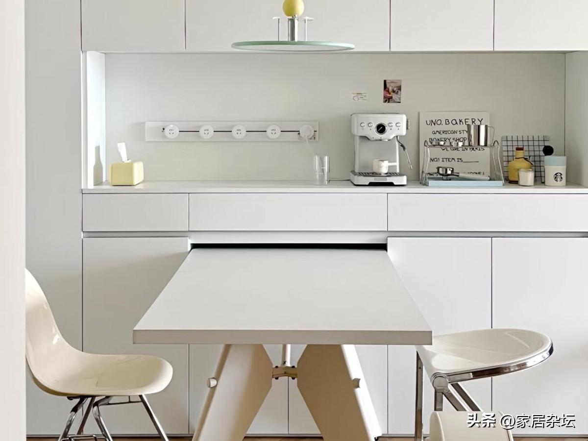 嵌入式餐桌。又或者是櫥櫃嵌入式抽拉桌,將桌面完美隱藏於定製的櫥櫃或者是餐邊櫃櫃中,用的時候拉出來,面積也很大。收起來,渾然一體。