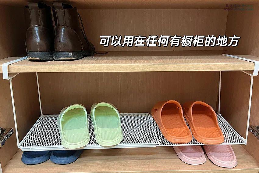 這玩意兒像個變形版的小貨架,應用在空間較大的鞋櫃內,就可以實現多層收納,關鍵是可以根據需要,能伸縮長短,方便又實用。