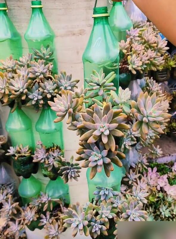 那些裁出波浪邊的瓶口種滿虹之玉,陽光底下閃着細碎的光,比精品店的水晶擺件更有生氣;剖開的瓶身掛起來當吊籃,風一吹肉葉輕顫,整個陽臺都跟着活泛起來。