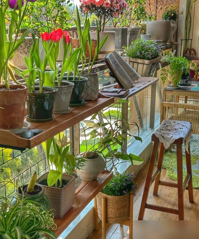 現在年輕人總焦慮沒大房子沒露臺,可看看這十平米:綠植按高矮錯落上架,藤蔓順着支架爬,花開時層層疊疊像立體畫——螺螄殼裏做道場,靠的是肯花心思的巧手。