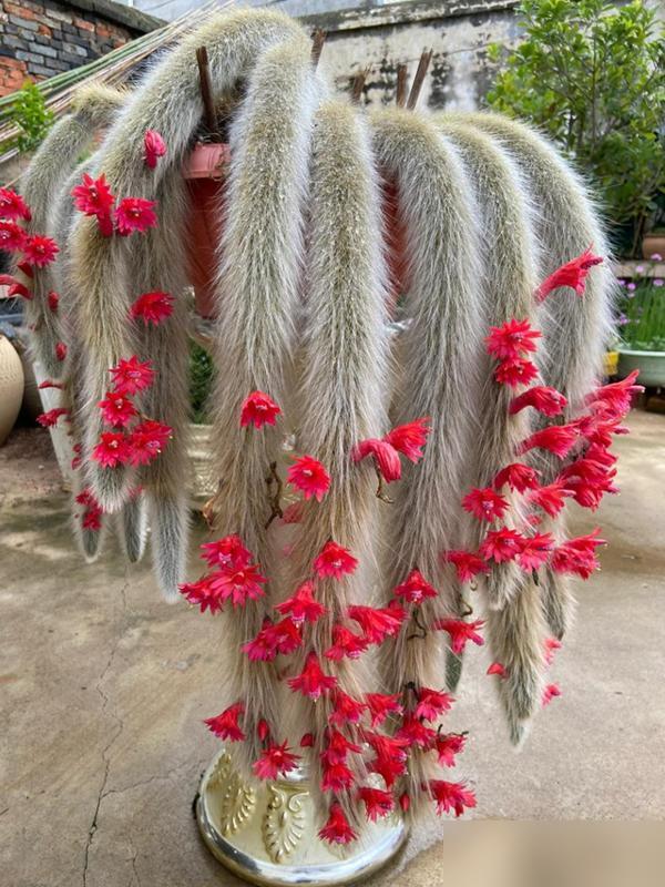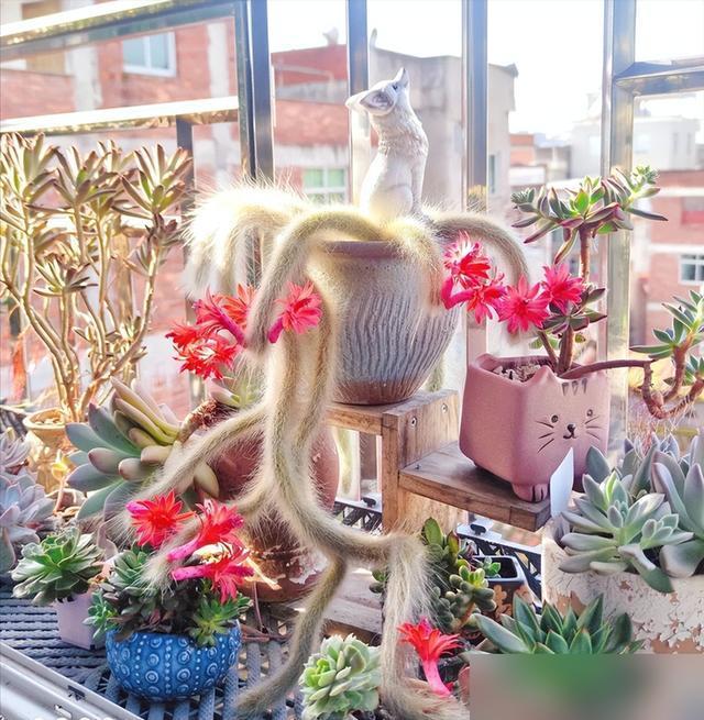 你要是光澆水不管造型,它可不就成了“暗黑風”?但花點心思,換個粗陶盆、擺個小狐狸擺件,或者垂尾間綴點青苔石,立馬就“仙境模式”了。陽光底下毛尖透銀光,紅花從白毛裏鑽出來,像點了硃砂,那叫一個驚豔。俗話說的好,“養花先養心”,花好不好看,全看主人會不會盤。養護上倒不嬌氣,耐旱耐曬,夏天熱浪滾滾它照樣挺着。土得透氣,用顆粒土混火山石;澆水要“見幹見溼”,別把根悶壞了;最要緊是光照,每天四小時散光,毛色才能雪白透亮。
