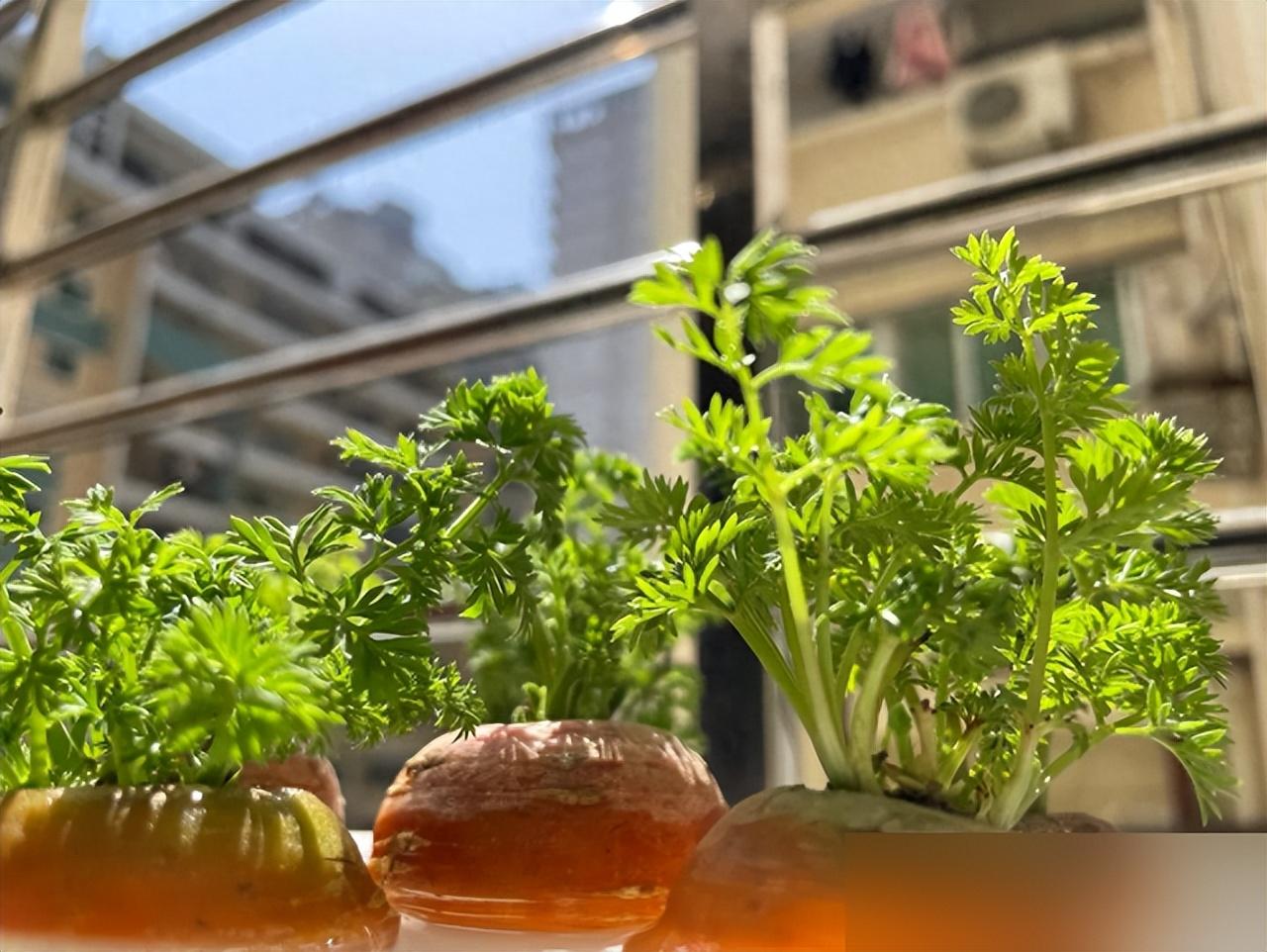 發芽的紅薯切半截坐奶茶杯裏,根鬚能垂成綠簾子;胡蘿蔔頭淺水養三天,羽毛葉自帶小清新濾鏡;芋頭髮了芽,葉片撐開活像微縮版滴水觀音。