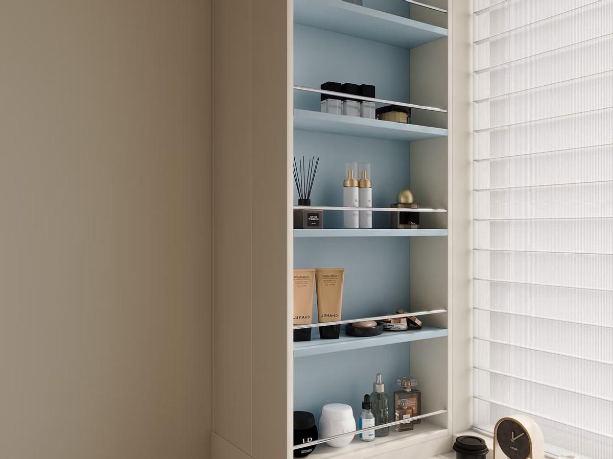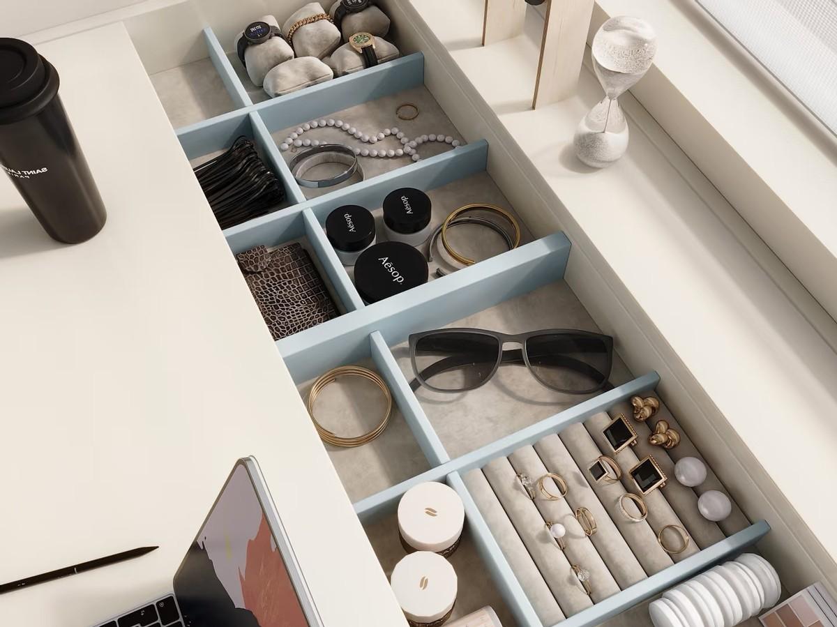 飄窗整體的裝修方案是一體化梳妝檯。下面是抽屜,兩面是收納格,上面鋪的是板材。平時可以作爲化妝臺使用。而且,在上面放上一個小茶几,也就是一個非常好的觀景區。
