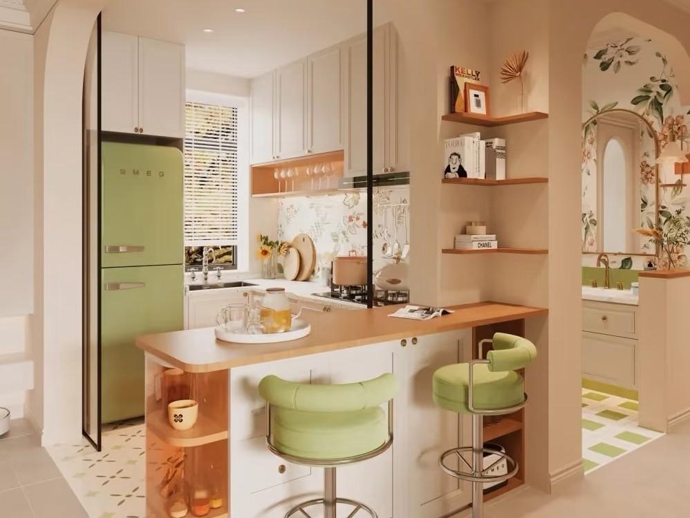 廚房別再只知道傳統的封閉式廚房來,試試現在目前流行的半開放式。例如雙面玻璃牆或者是牆體上開洞做吧檯,都會帶來非常好的體驗。