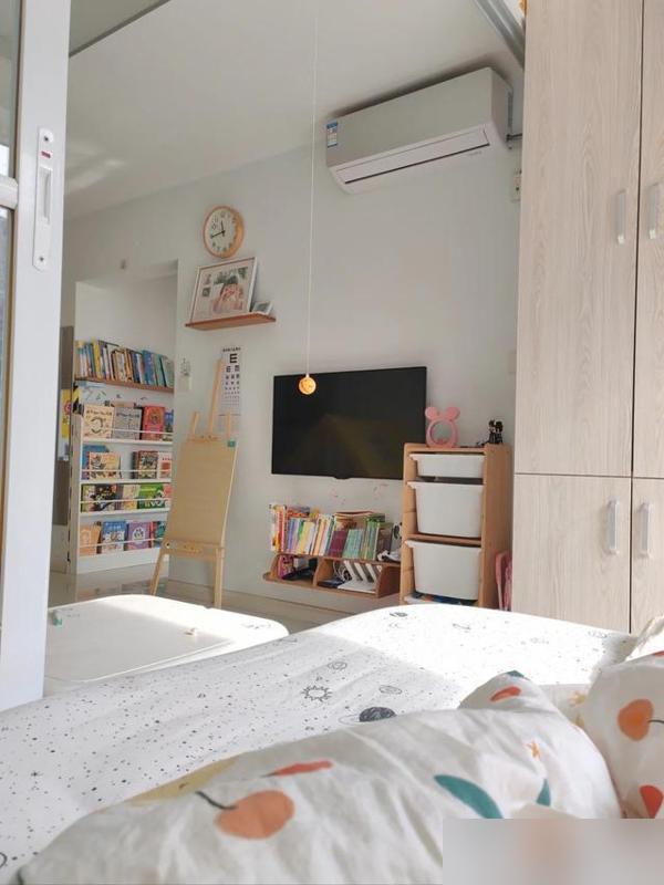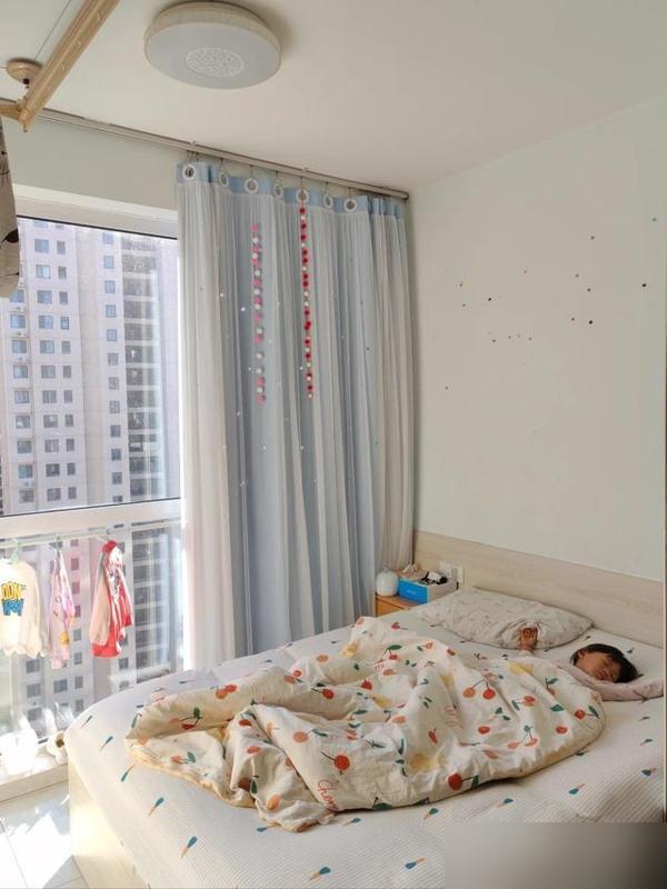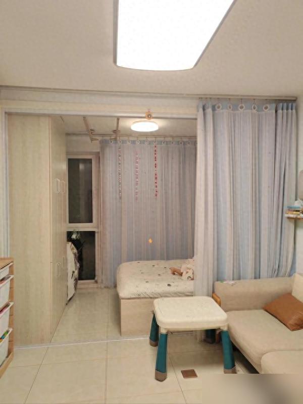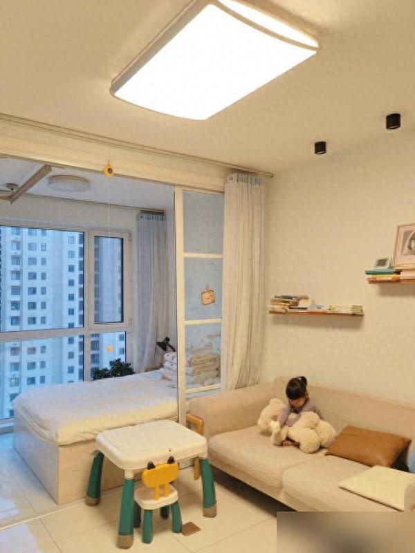 那女子動點腦筋,推拉門加布簾當隔斷,白天拉開客廳不憋屈,晚上一關娃就有了獨立小天地,多靈活的設計。