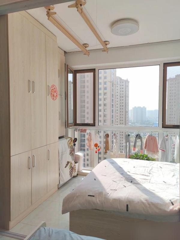 晾曬問題也不用愁,頂上加升降杆曬大件,窗邊短杆掛小衣物,白天曬晚上收,一點不吵孩子。