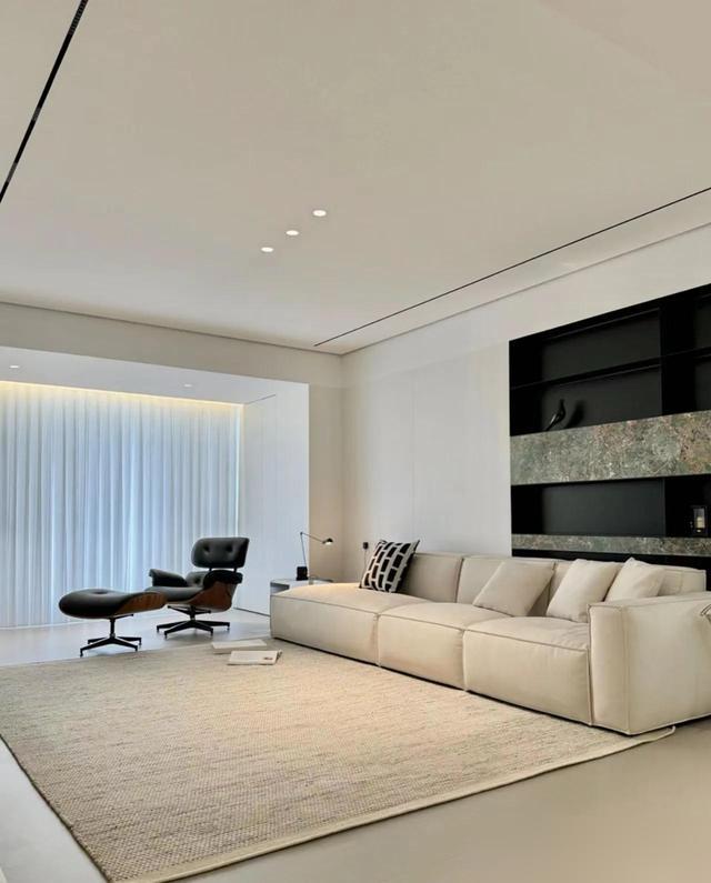 電視牆石膏板拉線條,內嵌屏幕藏雜線;暖灰沙發配淺色地毯,坐上去軟如陷進棉花堆。