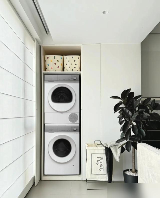 洗衣機烘乾機摞進定製櫃,升降晾衣杆藏天花板,洗完衣服一拉就掛,平時徹底隱形。