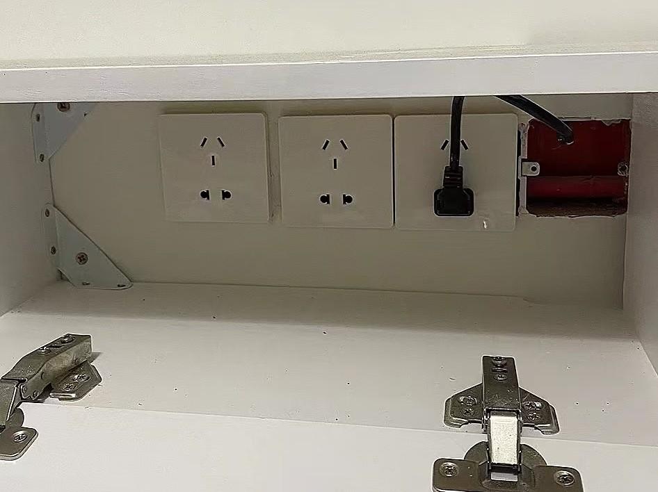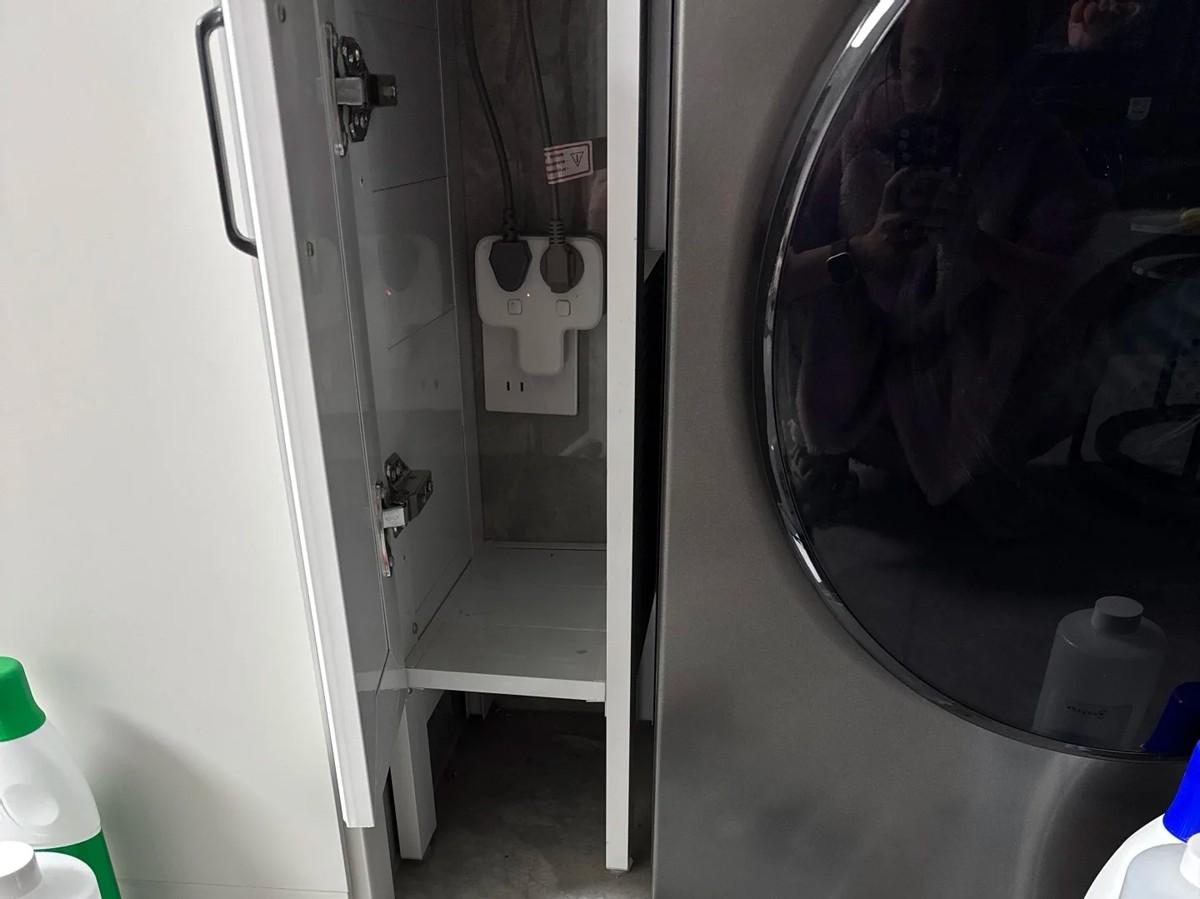 她家的洗衣機,是嵌在櫃子裏。洗衣機的電線也是從上面穿過來,然後進入這個插座位置。整個插座倒着裝,然後這個電源線是倒着插進去的。
