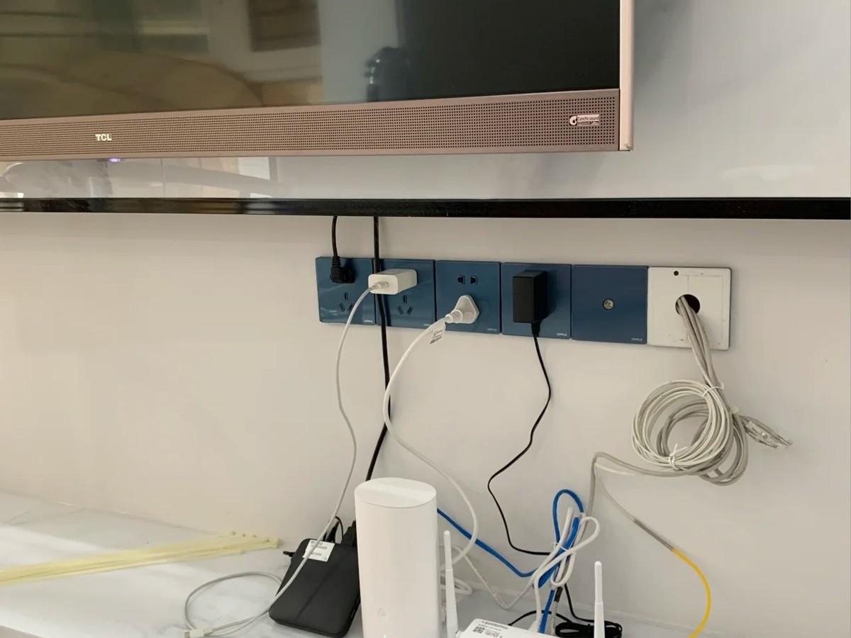 客廳電視插座,是放在電視櫃裏面的,電線是從上面下來的。