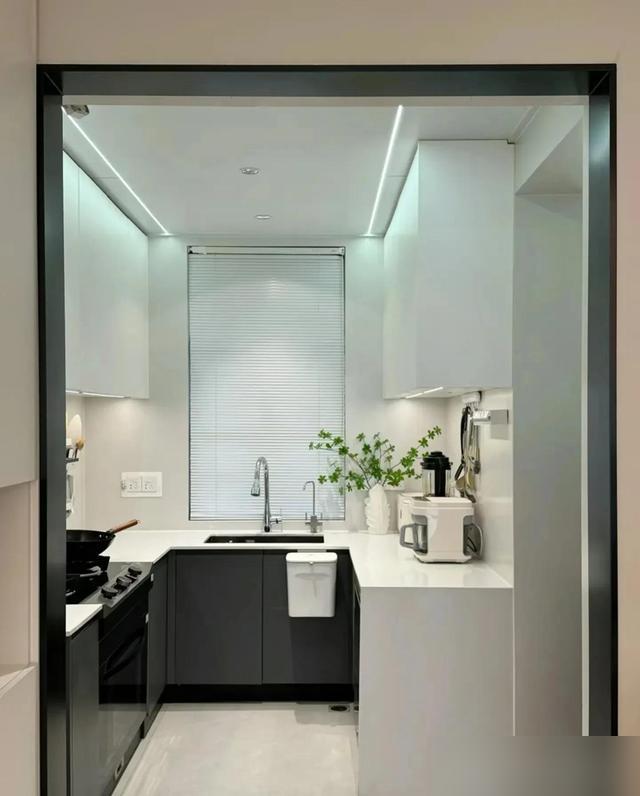 廚房雖小但動線流暢,U型櫥櫃轉身就能洗切炒,無把手櫃門用抹布一擦就亮堂。
